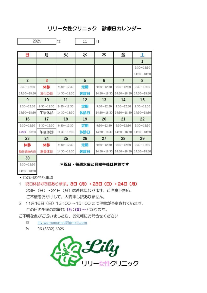 2025.11月の診療日カレンダー 投稿日:2025.10.21 ピンチアウトすると拡大して表示されます。 11月は祝日休診が3回あります。 3日(月)・23日(日)・24日(月)です。 11月16日(日)13 : 00~15 : 00 に全館停電が予定されています。 この日の午後の診療は 15 : 00~とさせていただきますので、よろしくお願いします。